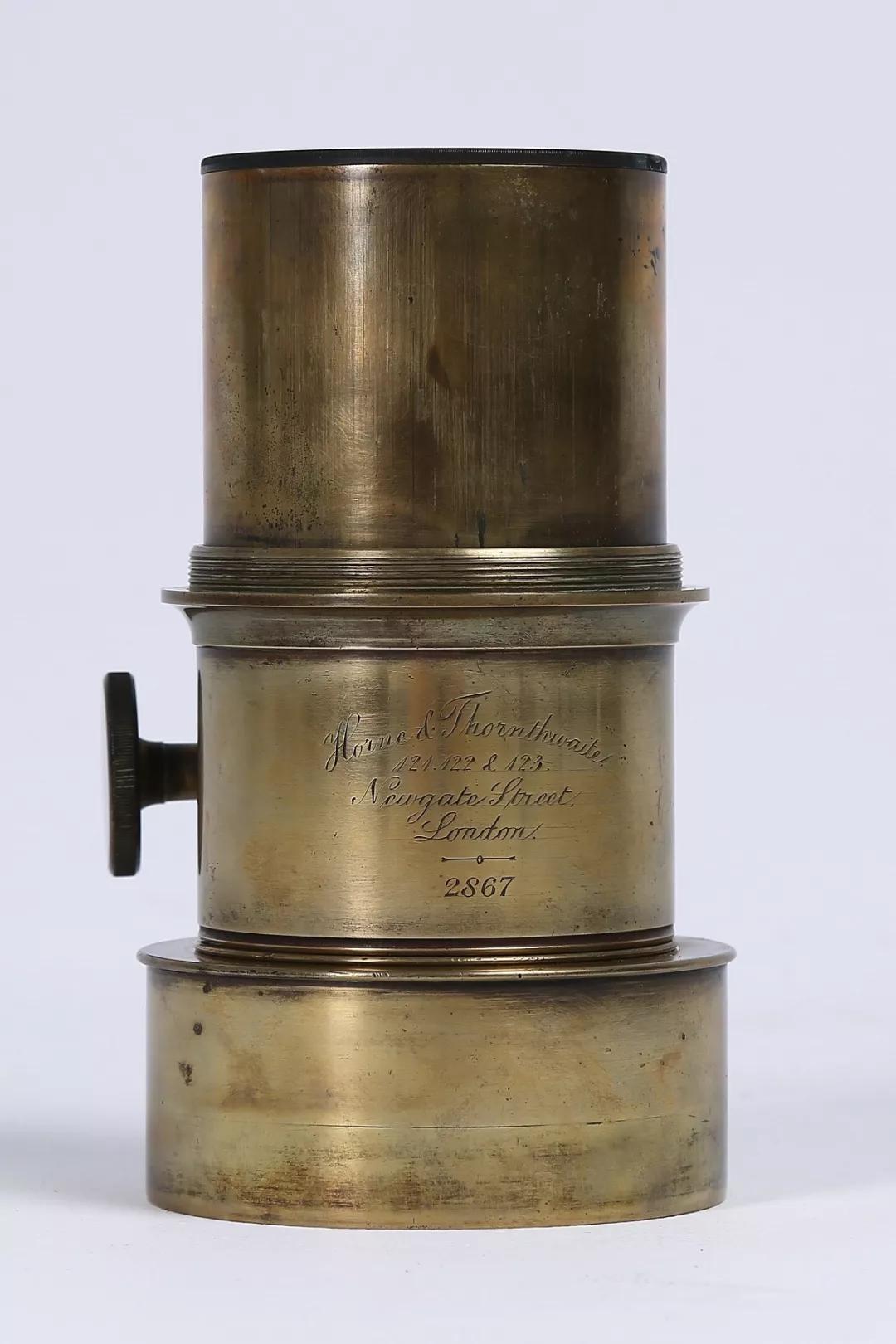 相機(jī)片夾(匣)缺失。鏡頭為匹茲伐(Petzval)250mm F4.5 人像鏡頭(圖 06),鏡頭編號(hào):2867,由英國(guó)霍恩公司于 1841 年至 1842 年制造。這只鏡頭由黃銅制成,又大又重,側(cè)面有個(gè)旋鈕用來(lái)調(diào)焦(圖 07)。