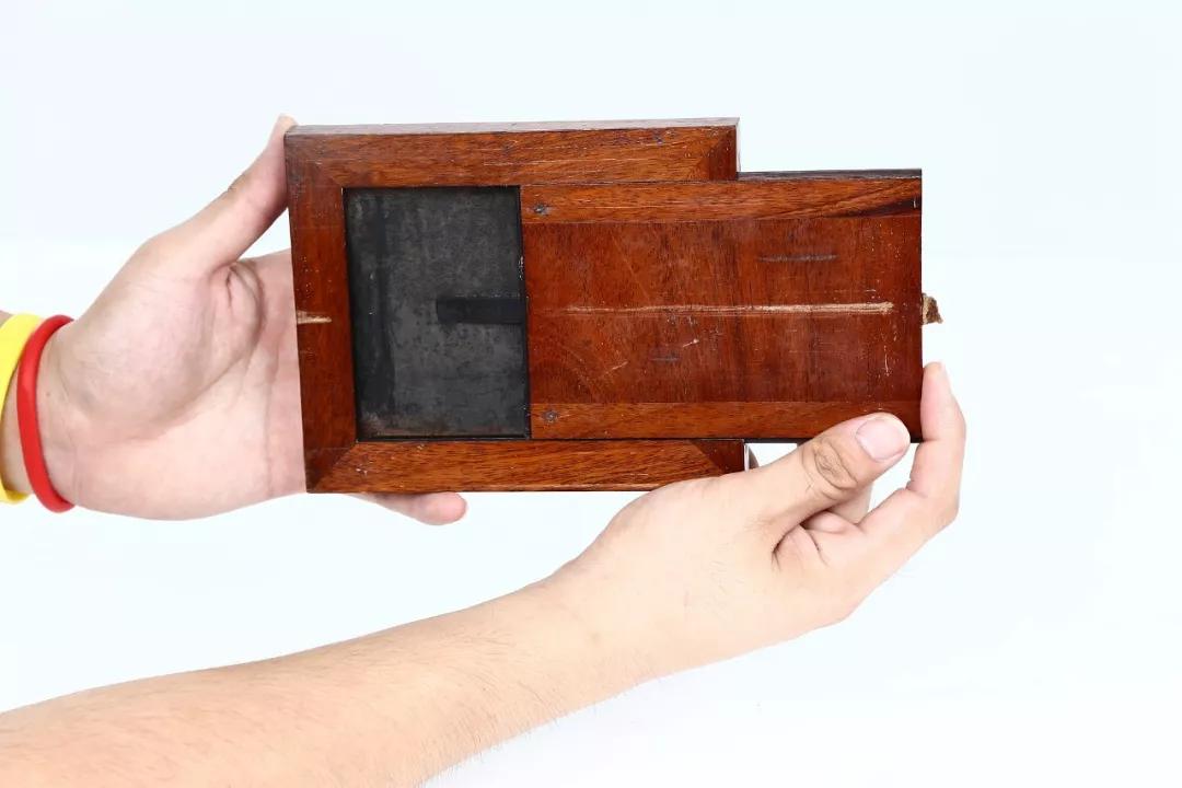 本人有幸收藏了這樣一臺(tái)尾板式滑箱照相機(jī)(圖02)。這臺(tái)相機(jī)是 1841-1842 年間在法國(guó)生產(chǎn)的,機(jī)身由胡桃木制成,尾板式滑箱結(jié)構(gòu)(圖03),金屬配件均為黃銅制。