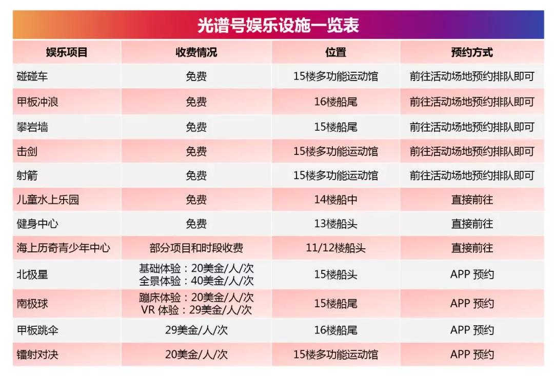 光譜號的娛樂設(shè)施,和量子號相比有增無減,受歡迎的程度也不用小編多說啦!上船之后要是想要玩一些項目的話,記得及時預(yù)約哦。