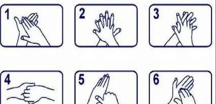 使用肥皂或洗手液并用流動水洗手,推薦以下洗手六步法: