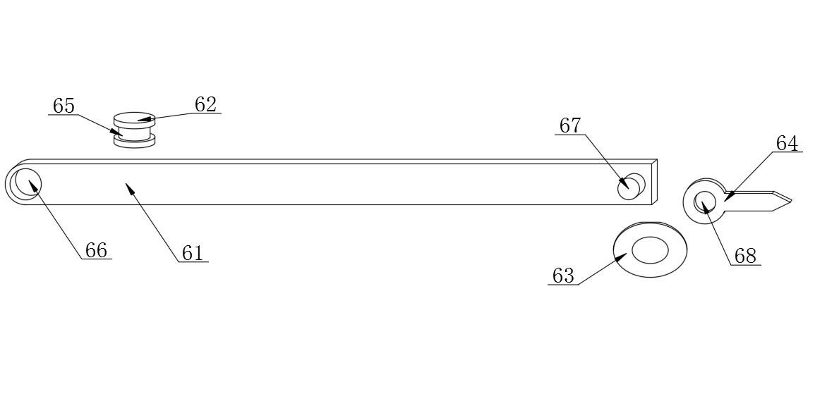 所述指向件6包括連接桿61,所述連接桿61一端設(shè)有定位柱62,所述連接桿61另一端設(shè)有固定吸盤63,所述固定吸盤63與連接桿61之間設(shè)有指示標(biāo)64,所述定位柱62中部開設(shè)有轉(zhuǎn)向槽65,所述連接桿61與定位柱62連接處設(shè)有第一通孔66,所述連接桿61另一端固定設(shè)有固定柱67,所述固定柱67遠(yuǎn)離連接桿61一端與固定吸盤63固定連接,所述指示標(biāo)64與固定柱67連接處開設(shè)有第二通孔68。