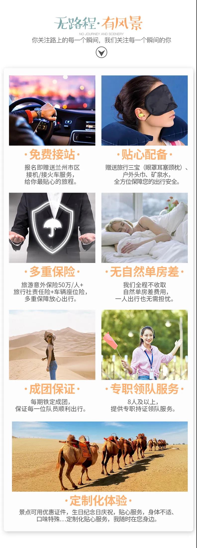 1. 敦煌莫高窟景區(qū)自2015年6月起實(shí)行數(shù)字展示中心數(shù)字洞窟展示和莫高窟實(shí)體洞窟體驗(yàn)的預(yù)約參觀模式,每天限6000人參觀,團(tuán)隊(duì)參觀時(shí)間嚴(yán)格按照莫高窟預(yù)約場次進(jìn)行,因此,敦煌段景點(diǎn)參觀順序會(huì)根據(jù)莫高窟時(shí)間進(jìn)行調(diào)整或同團(tuán)客人安排不同時(shí)間游覽,敬請(qǐng)配合。
