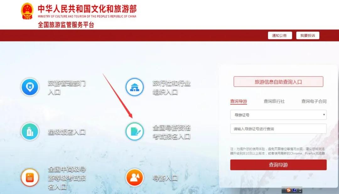 (進(jìn)入“全國旅游監(jiān)督服務(wù)平臺(tái)”,選擇“全國導(dǎo)游資格考試報(bào)考入口”入口登錄)