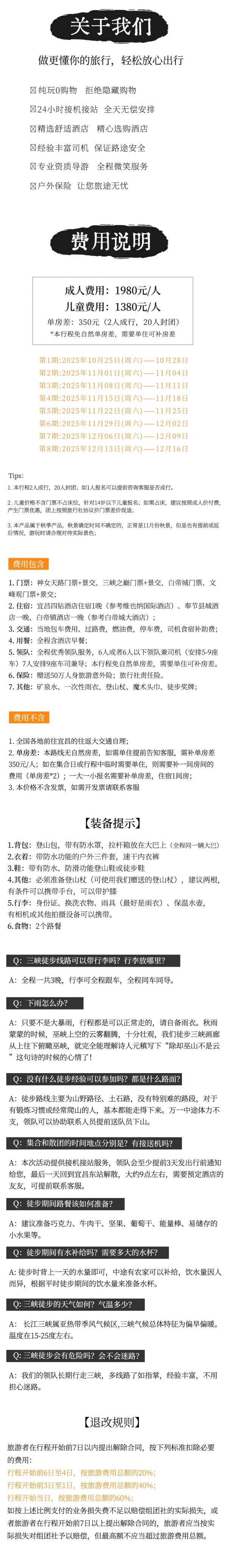 A:本次活動提供接機接站服務(wù),領(lǐng)隊會至少提前3天發(fā)出行前通知給您,最后一天回到宜昌東站解散,大約9點左右,需要預(yù)定酒店的友友,可提前聯(lián)系客服