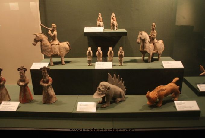 館內(nèi)珍藏著歷代陶俑,時代包括秦、漢、北朝、隋、唐和宋、元、明、清。質(zhì)地有陶、彩繪陶、釉陶和三彩。藝術形象有文武官員、甲士侍衛(wèi)、男仆女侍、西域胡人,以及天王、鎮(zhèn)墓獸和馬、駱駝等各種動物。