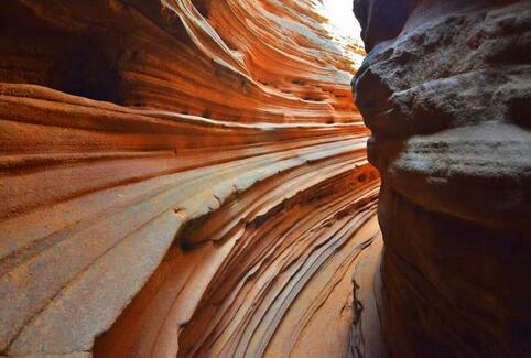 波浪谷是一種紅砂巖地貌,因巖砂上的紋路像波浪,被叫做"TheWave",即波浪。上世紀(jì)80年代,人們?cè)诿绹?guó)亞利桑那州和猶他州交界處發(fā)現(xiàn)了波浪谷,神奇的外觀和極高的科研價(jià)值使其成為了世界八大巖石奇觀之一。而靖邊的波浪谷也有著與美國(guó)波浪谷媲美的紅砂巖峽谷。中國(guó)靖邊波浪谷和美國(guó)波浪谷的差距并不大,都是紅砂巖地貌,靖邊波浪谷更加年輕,只有6000萬(wàn)年,很多砂土還沒(méi)來(lái)得及凝固為巖石,地處黃土高原與毛烏素沙漠交匯地帶的靖邊縣龍州鄉(xiāng)。
