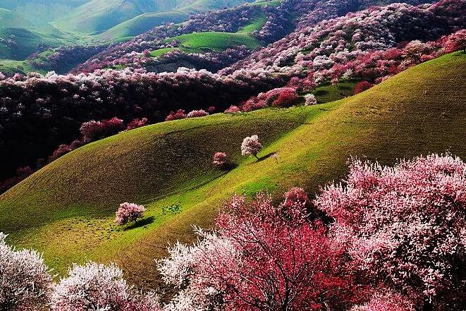 早餐后乘車前往參觀【吐爾根杏花溝】。(賞花時間根據(jù)當(dāng)?shù)氐臍夂蚝吞鞖鈼l件決定,敬請諒解)每年四月份起,伊犁河谷開始進(jìn)入一個美麗浪漫的季節(jié),山上、草原上的果花、草花次第盛開,美不勝收!最先盛開的就是野杏花。那個季節(jié)野杏花綿延十幾公里,粉紅的、雪白的杏花把一個個山頭妝扮起來,牛羊似珍珠灑落在花林間、草坡上。最震撼是這種自然、原生態(tài)的壯美,一個花海的世界、一個迷人的仙境!抵達(dá)新源用晚餐,晚餐后入住酒店。