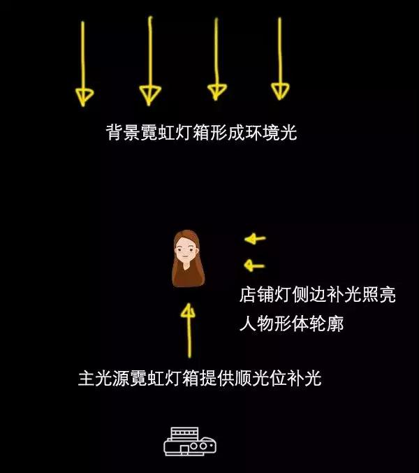 這里的背景和環(huán)境光主要是來自霓虹燈箱,和主光源有天然而且很好的一致性,整體影調(diào)就會(huì)很自然。