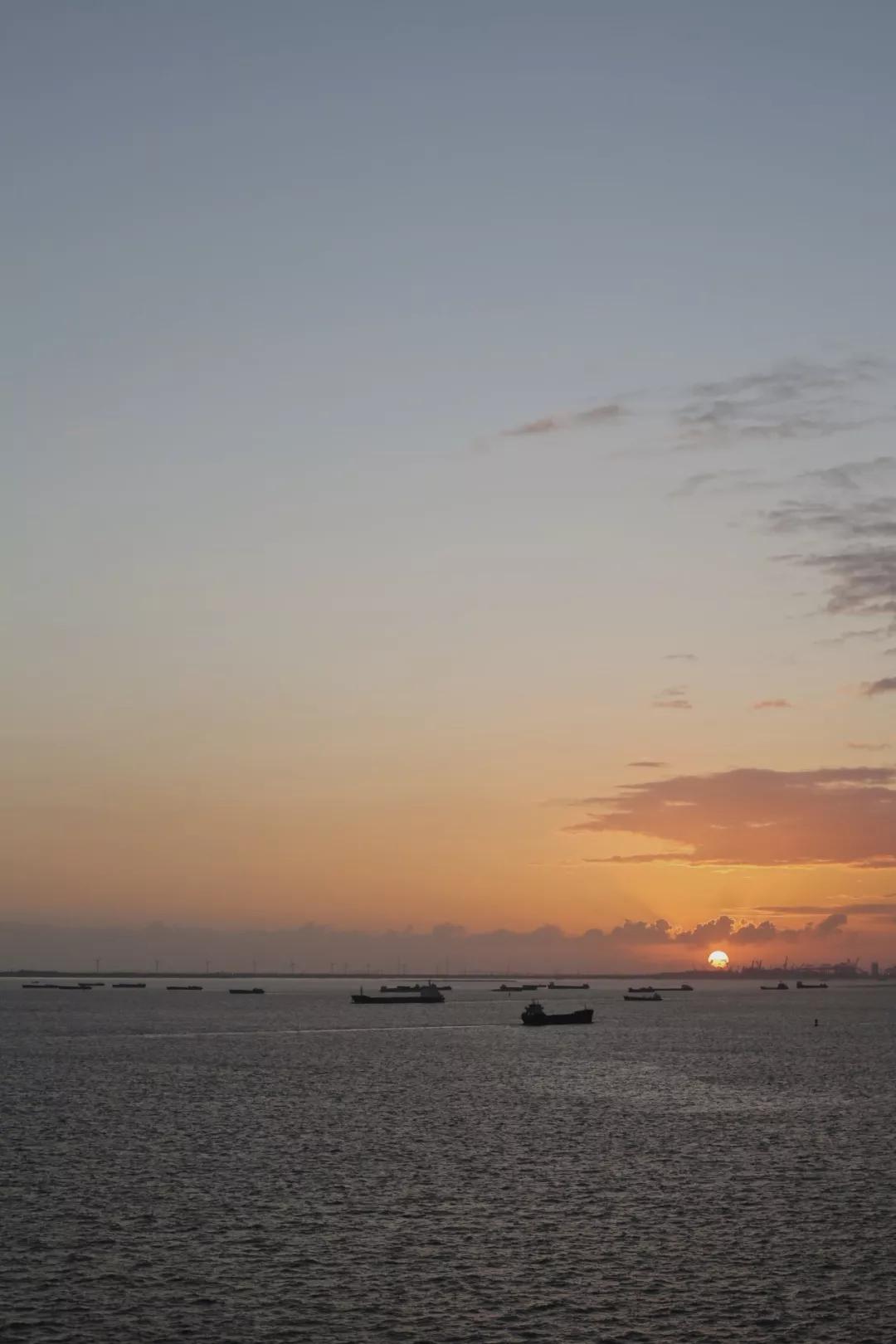 清晨的甲板安靜極了,大概前一晚喧鬧的人們正在酣睡,晨風(fēng)吹得衣袂飛揚(yáng)。天空中的黃暈已經(jīng)從沉睡中蘇醒,帶著不刺眼的光芒從飄渺的云霧里一點(diǎn)點(diǎn)伏起,天越來(lái)越亮。