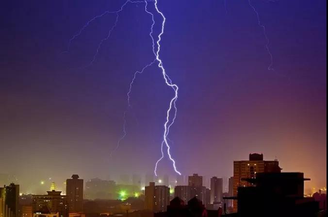 在這張照片里,攝影師很巧妙的捕捉到了閃電,天空的藍(lán)色和城市燈光所暈染出的紫色給照片蒙上了一種怪異的感覺(jué)。
