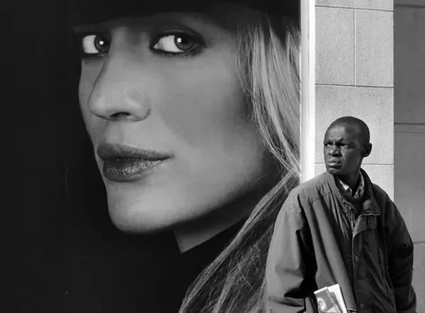 突出被攝主題的一個(gè)有效方法是讓它的尺寸看起來不太一樣,上面這張照片巨幅廣告里的女主角比實(shí)際生活中的男主角要大的多,對比起來,那個(gè)在角落里的黑人男性是那么卑微。