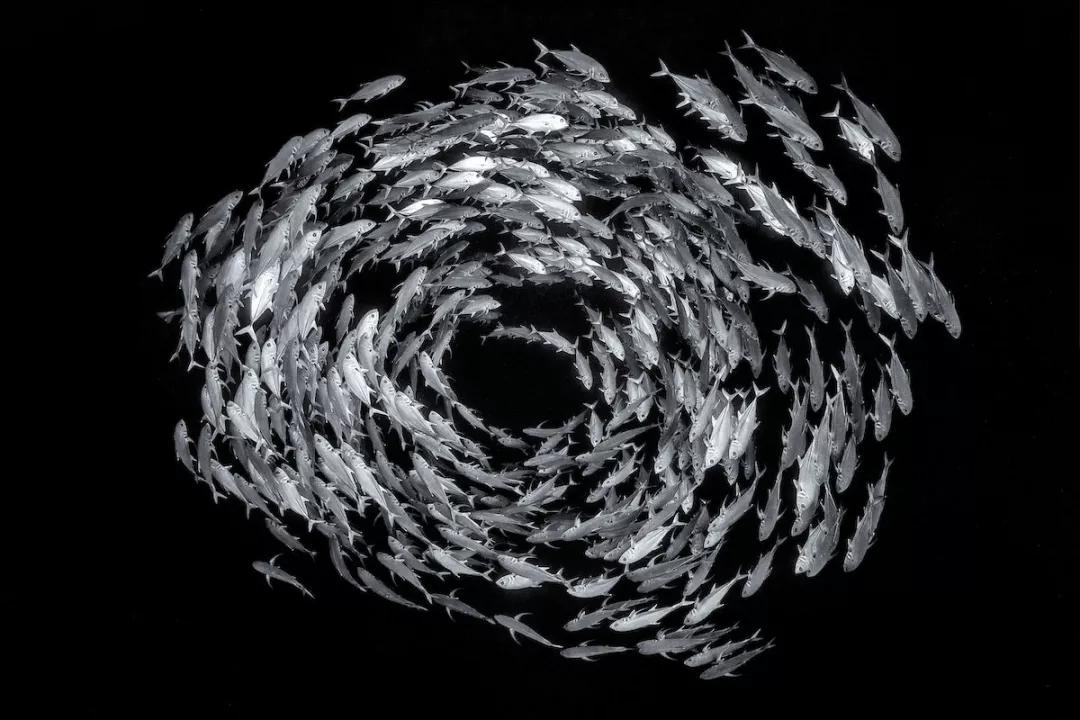 一大群六帶鲹在水里組成了環(huán)狀,它們這一行為是交配前的約會練習(xí),同時還可以威嚇一下潛在捕食者。像這樣的聚會產(chǎn)卵很容易被捕漁者一鍋端,但幸運的是,這群魚生活在紅海禁止捕漁的海洋保護區(qū)域內(nèi)。