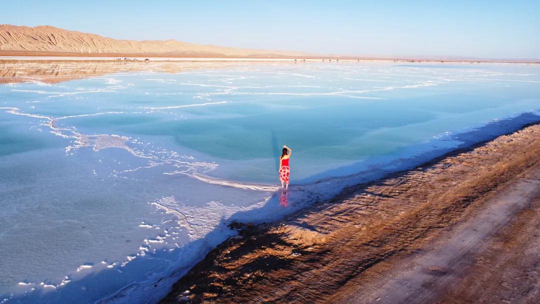 在水上雅丹不遠處便是【東臺吉乃爾湖】。東臺吉乃爾湖被稱為“中國的馬爾代夫”,湖水呈現(xiàn)純正的蒂芙尼藍;乃爾湖岸邊盡是覆蓋著的白色結晶,湖周圍是大片的雅丹地貌,搭配上顏色干凈到極致的湖水、西北特有的廣闊無垠的天空,純粹而強烈的視覺沖擊,這方圓百里大漠戈壁無人區(qū)的珍寶明珠,這只屬于大自然的神秘顏色,讓你仿若來到了世界的盡頭,讓你感受一種歸于自然的內心平靜。