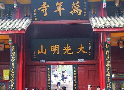 在萬年寺一帶,山民村舍錯落,宛如一幅恬靜的山鄉(xiāng)景色畫圖。萬年寺是峨眉山八大寺廟之一,創(chuàng)建于晉,稱普賢寺,唐時改名白水寺,宋時為白水普賢寺。
