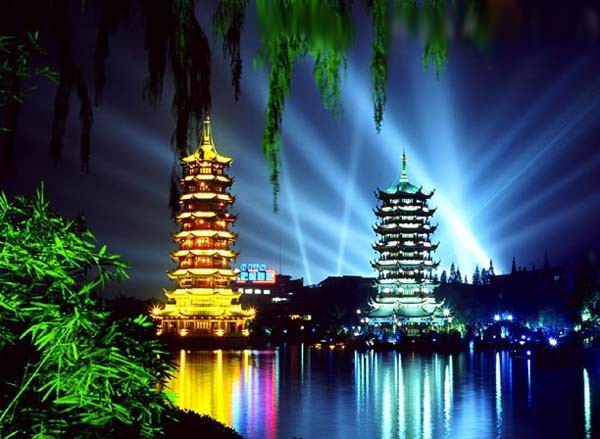 桂林日月雙塔號稱世界第一銅塔,是桂林旅游的一個絕美夜景觀賞地。地處桂林市中心區(qū),座落在桂林城的中軸線上,與“象山水月”相鄰。象山是桂林的城徽,而雙塔則是新桂林的標識。其中日塔高41米共九層,通體均為純銅裝飾,耗用銅材350噸,金碧輝煌,并有電梯供游客觀光乘坐。銅塔所有構件如塔什、瓦面、翹角、斗拱、雀替、門窗、柱梁、天面、地面完全由銅壁畫裝飾,整座銅塔創(chuàng)下了三項世界之最——世界上最高的銅塔,世界上最高的銅質(zhì)建筑物,世界上最高的水中塔。 月塔高35米共七層,為琉璃塔。每層的雕花彩繪門窗寓意不同的主題,富含中國傳統(tǒng)韻味,通過水下18米長的水族館與日塔連接,其地宮之中有桂林明代青花梅瓶大型壁畫。杉湖日月雙塔已成為觀賞桂林城市精華美景的勝地。