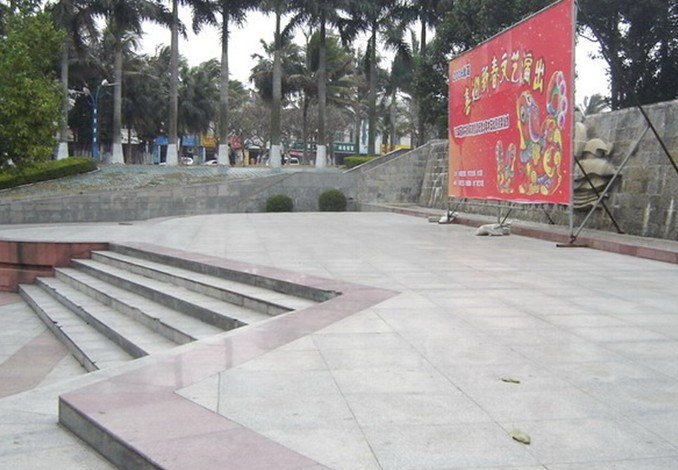 靠近北部灣中路的文化廣場區(qū)由林蔭廣場、露天表演廣場和展覽館三部分構成。林蔭廣場綠化選擇具有南方特色闊葉喬木水石榕為主要樹種,這種樹根據(jù)長勢可以修剪成方體或珠體形狀,形成規(guī)矩,整齊的廣場綠色景觀,樹下設置有簡潔大方,別具熱帶風情的“C”形木椅,同時還設計有造型活潑的閱報欄,露天表演廣場是利用原有地形建成的開敞式的公共文化娛樂和休息場所,面積約2000平方米,依就原地形建有長形的水幕墻、巨型浮雕“海之韻”、露天表演舞臺、音樂茶座、階梯級觀眾看臺、騎樓式店鋪、斜坡式花壇、殘疾人斜坡道等園林設施,創(chuàng)造了一個優(yōu)雅宜人、景觀獨特的室外環(huán)境;展覽館是利用原水廠蓄水池改造而成的頂面為球殼形的一座造型十分獨特的建筑,占地約500平方米,屬無梁磚拱結構,既保留了歷史建筑工藝,又可作為公共展覽館,豐富了廣場的文化內容。