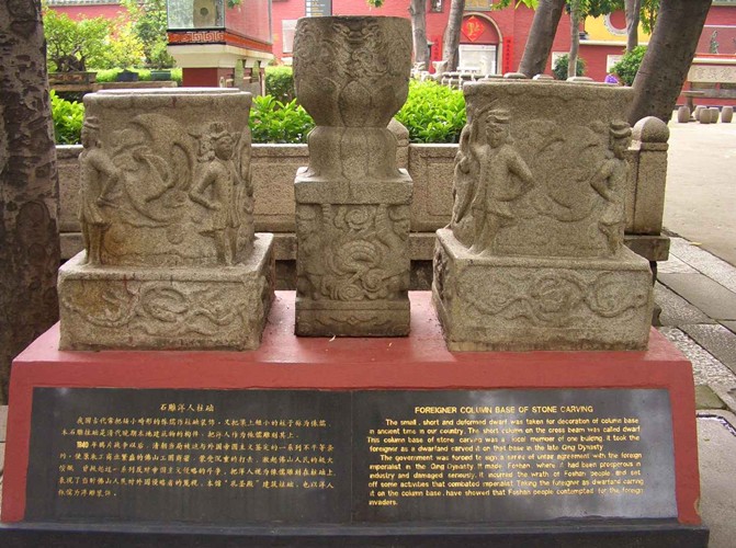 祖廟的正殿里廟內(nèi)還陳設(shè)了許多珍貴的藝術(shù)品,如70件33種兵器銅墻鐵壁儀仗,直徑1.31米的巨型銅鏡、大型銅鼎銅鐘和香爐。鐵器有大鐵鼎,鐵鼎,鐵畫等等。園內(nèi)還陳列有石刻匾額,明、清時期的石獸、碑刻唐代“貞觀二年”款棋字陽文“禪城”,石片旁的復(fù)制品。重新組合復(fù)完的陶塑瓦脊,大量的金木雕建筑構(gòu)件,大型鐵鑄武士立像,鐵鑄瑞獸、鐵炮等等。這些陳列品集中反映了明清時期佛山高超的工藝技術(shù)。無怪乎,一些前來參觀的外國朋友將祖廟譽為“東方民間藝術(shù)之宮”。