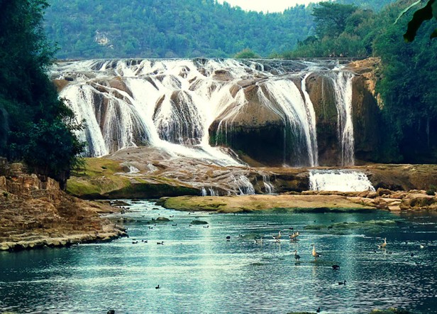 陡坡塘瀑布位于貴州省黃果樹瀑布上游1公里處,瀑頂寬105米,高21米,是黃果樹瀑布群中瀑頂最寬的瀑布。陡坡塘瀑布頂上是一個(gè)面積達(dá)1.5萬平方的巨大溶潭,瀑布則是形成在逶迤100多米長的鈣化灘壩上。陡坡塘瀑布還有一個(gè)特殊的現(xiàn)象:每當(dāng)洪水到來之前,瀑布都要發(fā)出“轟隆。轟隆”的吼聲,因此又叫“吼瀑”。