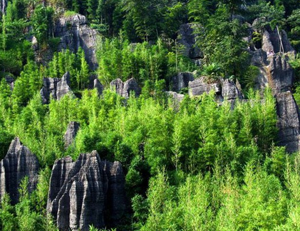 綠色石林地處貴州省貴陽市修文縣,占地1000多畝。景區(qū)內(nèi)眾多奇峰怪石拔地而起,似劍如戟,破土直刺蒼穹。石峰最高達30余米,又有地峽石罅幽深曲折。因綠樹古藤、蟠枝虬根常年攀附石峰,使石林平添了幾許柔情,獲得了“綠色”石林的美譽。又因它造型迥異的石形而贏得了“擬態(tài)動物園”的美名。