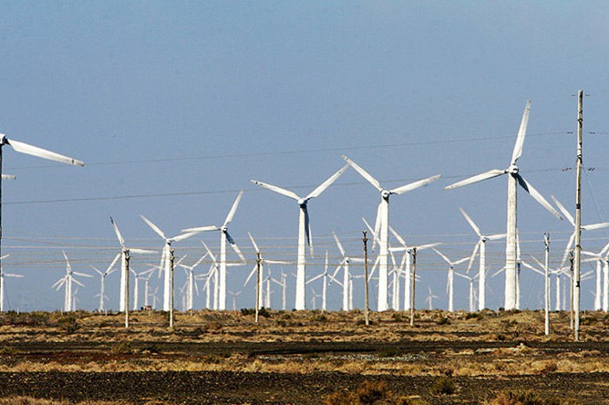 在烏魯木齊去吐魯番的途中,沿路南行,在通往絲路重鎮(zhèn)達(dá)坂城的道路兩旁,上百臺(tái)風(fēng)力發(fā)電機(jī)擎天而立、迎風(fēng)飛旋,與藍(lán)天、白云相襯,在博格達(dá)峰清奇峻秀的背景下,在廣袤的曠野之上,形成了一個(gè)蔚為壯觀的風(fēng)車大世界。這里就是目前我國(guó)最大的風(fēng)能基地——新疆達(dá)坂城風(fēng)力發(fā)電廠。