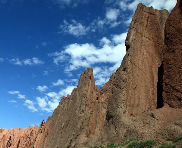 維吾爾語“克孜利亞”是“紅色的山崖”之意。神秘的“天山大峽谷”是天山支脈克孜利亞山中的一條峽谷,紅褐色巖石經(jīng)過大自然億萬年的風(fēng)刻雨蝕之下,才形成由現(xiàn)在“天山大峽谷”。“天山大峽谷”紅褐色的山體群直插云天,在陽光照射下,猶如一簇簇燃燒的火焰。“天山大峽谷”的迷人之處,不僅僅在于它的雄奇、險(xiǎn)峻,而在于它的幽深、寧靜和神秘。站在谷底仰視高山,只覺得陡峭的峰巒似乎隨時隨刻都會壓下來,令人感到窒息、眩暈。